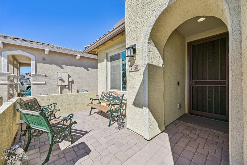 Listing details for 17150 Fallen Leaf Ln, Surprise, AZ 85387 : This beautifully designed single-story twin home offers an open-concept layout that seamlessly connects the kitchen, Great Room, and dining area -- creating one large gathering space. A sliding glass door extends the living area to the covered patio, effortlessly blending indoor and outdoor living. The thoughtfully designed split-bedroom floor plan provides privacy, with a secondary bedroom at the front of the home and the owner's suite tucked away in the back. The large owner's retreat features a private bath and is complemented by extra-tall doors throughout the home for an added sense of openness. Updates include a brick paver walkway surrounding the home and extending to the spacious covered patio, a water softener, and a stylish barn door accent in the primary bathroom.