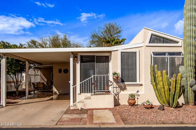 Listing details for 17200 Bell Rd #119, Surprise, AZ 85374 : Welcome to Happy Trails Resort, a highly sought-after 55+ guard-gated golf course community, perfect for full-time living or a seasonal snowbird retreat. This well-maintained home offers greenbelt views and a versatile flex room that can be used as an office, guest space, or additional storage. The spacious AZ room overlooks the greenbelt, creating a relaxing setting to enjoy Arizona living. The property features a new irrigation system, mature grapefruit and orange trees, stack washer and dryer, storage shed, and covered parking. Furnishings are available for a turnkey opportunity, making this an ideal lock-and-leave winter home. A golf cart is available on a separate bill of sale. Enjoy resort-style amenities including golf, pools, clubhouse, fitness center year-round social events.