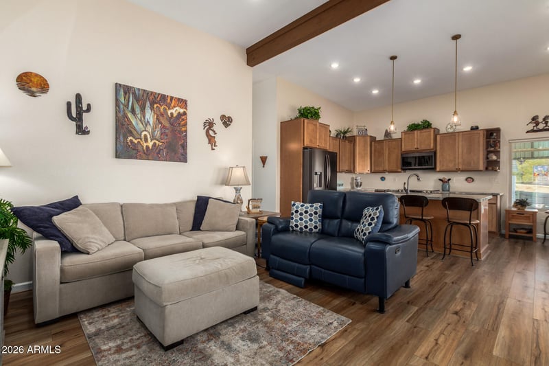 Vaulted ceilings throughout and a Brazilian quartz kitchen countertop create an entertaining area in the casita to view the golf course and the beautiful