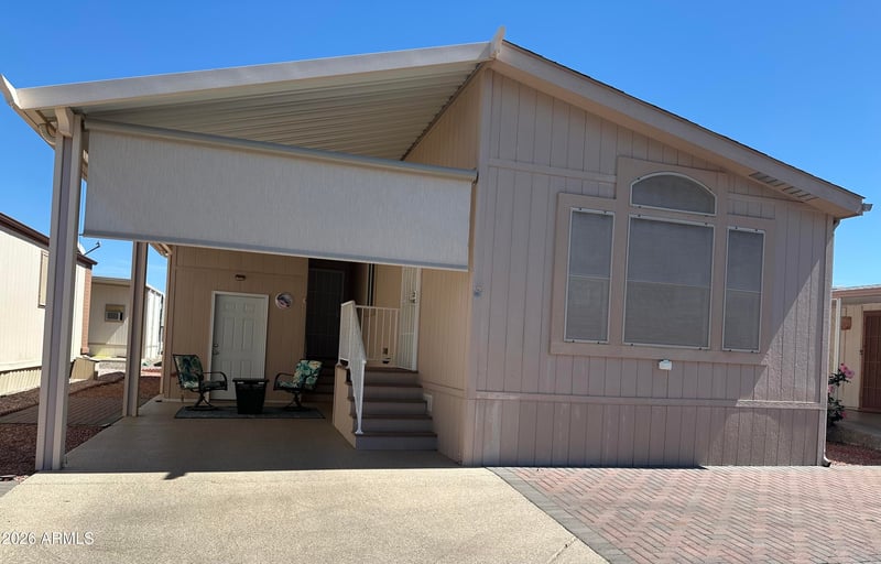 Listing details for 17200 Bell Rd #1658, Surprise, AZ 85374 : ***HOME WARRANTY INCLUDED***Check out this delightful 2-bedroom, 1.5 bath snuggle-wide home. This immaculate, well-maintained home features updated lighting throughout. The vaulted ceilings really add to the warmth and comfort for you. Home features a well-appointed kitchen with deluxe cabinets, counters and black appliances. The second bedroom is versatile with a desk and a beautiful barn door too! Exterior offers an ELECTRIC SHADE for privacy and an additional outlet installed for your convenience. There is also a super clean storage shed. Furniture and furnishings are being left with the home.