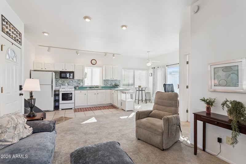 Listing details for 17200 Bell Rd #869, Surprise, AZ 85374 : Stop renting and start owning! This unique property at Happy Trails is designed for the modern RV'ers who refuse to compromise on comfort. The heart of the home is a versatile 470 sq. ft. Arizona Room—ready to be configured as your ultimate lounge, hobby den, or suite. Live the perfect RV lifestyle that you dreamed about. This home offers covered RV parking with hook-ups on immaculate, stamped concrete with outdoor patios for entertaining. The open AZ room includes an bright kitchen with refrigerator, range, microwave, reverse osmosis water filter, disposal; a dining space; a media nook; a full bath; very efficient mini-split A/C / Heat unit; and, a loft accessible with stairs for extra storage, a desk or a blow up mattress for guests (the loft isn't included in the sf due to its low ceiling height).