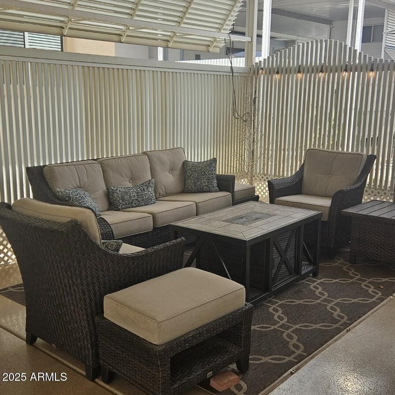Listing details for 17200 Bell Rd #901, Surprise, AZ 85374 : Located in fabulous Happy Trails Resort. 2013 Cavco, 1BR/1BA Park Model, Lot #901. This is an amazing oversized, covered corner lot - great for relaxing and entertaining. You own the property; no land lease! Low HOA. Interior is partially furnished as shown. Home updated in 2024/2025 with full tile shower remodel w/glass enclosure, laminate plank flooring throughout, new baseboard/crown molding, stainless steel appliances, garbage disposal, stainless sink/faucet, and high-rise toilet. New ceiling fans in LR and BR as well as fresh interior and exterior paint. Sky lights and vaulted ceilings make this home light and bright. Vibrant 55+ community with endless activities: pickleball, pools, spas, clubs. THIS DESIRABLE CORNER LOT WON'T LAST LONG, SO COME SEE TODAY!!!! Oversized lot is north/south facing and has a 2-story casita with LG stack washer & dryer, residential refrigerator, a mini-split A/C (all added in 2024), cabinet w/sink, and large storage cabinet. Fully finished upper level includes hot water tank and lots of storage. Outside has epoxy floors, pavers font/side and plant irrigation. All patio furniture, 50" TV, propane heater and Blackstone griddle are included as well as 5x7 Suncast storage shed. New 72" ceiling fan with LED lighting and remote control makes comfortable patio living.
