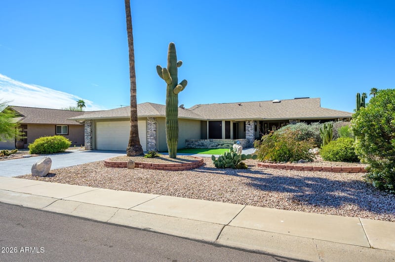 Listing details for 17226 125th Ave, Sun City West, AZ 85375 : TURN-KEY CACTUS MODEL! As you enter through the front door, you are greeted by the peaceful presence of HOME! Large living room and separate dining room. Kitchen offers a breakfast area and coffee bar area. Also, kitchen has been remodeled with new cabinetry & counter tops & SS appliances. There is a 2-car garage that has an EXTENSION to put your golf cart & a DOG washing station. Wait until you go to the backyard, you will be greeted with peaceful PRIVACY with its block fencing & no neighbors behind you. Patio has a new concrete slab extension for more outdoor entertaining. So much more to this great property. WELCOME HOME!