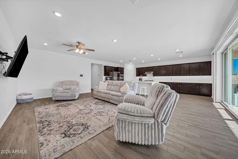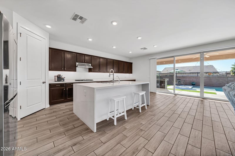 Listing details for 17259 Butler Ave, Waddell, AZ 85355 : Why wait to build when you can move right into this stunning 2020 built home that shows like a model? Featuring 4 bedrooms & 3 bathrooms, this thoughtfully designed layout includes a second ensuite style bedroom with double sinks, perfect for guests, multigenerational living, or a private home office setup. The heart of the home is the beautiful kitchen featuring a gas cooktop, generous counter space & an open concept layout perfect for entertaining. Enjoy the benefits of a N/S facing lot & 3 car tandem garage offering extra storage, a gym space, or room for toys. Step outside to your private backyard retreat featuring a sparkling pool, mountain views, and a view lot that offers extra privacy and a more open feel. Live the Arizona lifestyle you've been dreaming of without the build time.