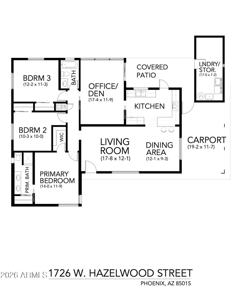 Listing details for 1726 Hazelwood St, Phoenix, AZ 85015 : Welcome! Beautifully remodeled in 2025, this move-in ready home blends modern finishes with everyday comfort. The new kitchen features Moonstone quartz countertops, Shaker cabinets and drawers, and stainless steel appliances, opening to a bright living space with newer vinyl windows and abundant natural light. Enjoy new LVP flooring and updated bathrooms, including a primary with dual vanity and walk-in shower, plus a refreshed hall bath with new tub and vanity. Major upgrades include a new sewer line and updated plumbing throughout. Outside offers fresh exterior paint, grass front and backyard, covered patio, and ample parking with carport and slab spaces. Bonus 147 SF laundry and storage room, plus gated additional outdoor storage. Come see this home!