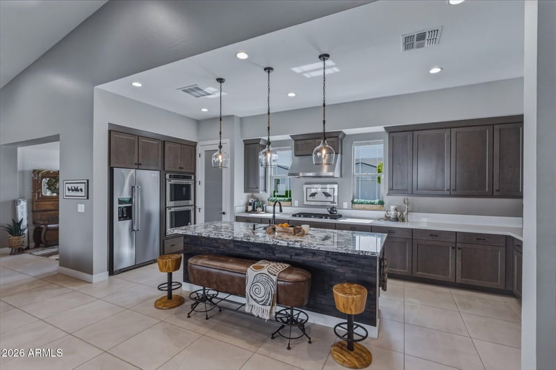 THIS BEAUTIFUL HOME , PROFESSIONALLY INTERIOR DESIGNED, IS FILLED WITH STUNNING STRUCTURAL AND DESIGN UPGRADES INSIDE AND OUT! VAULTED CEILINGS WITH BEAM, GREAT ROOM OPEN FLOOR PLAN, 24X24 ARIZONA FLOOR TILE PIETRA ITALIA, GORGEOUS LIGHTING THROUGHOUT, AND SO MUCH MORE! *PLEASE TAKE THE TIME TO REVIEW THE STRUCTURAL AND UPGRADED DESIGN OPTIONS LIST. THANK YOU! LET'S TAKE A LOOK AT THIS AMAZING CHEF'S KITCHEN WITH BUILT-IN DOUBLE WALL OVENS, MICROWAVE AND GAS COOKTOP. KITCHEN ISLAND WITH DELICATUS WHITE GRANITE COUNTERTOPS, MINERAL STAIN KITCHEN CABINETS WITH UPGRADED ELEGANCE PACKAGE. KITCHEN PERIMETER COUNTERTOPS AND BACKSPLASH IS WHITE QUARTZ. RECLAIMED WOOD ACCENT WALL-KITCHEN ISLAND AND CUSTOM WALK-IN PANTRY.