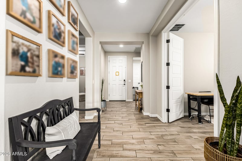 Listing details for 17355 Larkspur Dr, Surprise, AZ 85388 : Stunning 4-bedroom home in the sought-after Sweetwater Farms is now on the market! Explore the bright and spacious interior, featuring modern touches that showcase wood-look tile floors, plantation shutters, contemporary lighting, and stylish neutral accents. The open-concept kitchen boasts staggered shaker cabinets, tile backsplash, granite countertops, SS appliances, and an island with a breakfast bar, perfect for entertaining. The main suite is a true retreat, offering a spa-like bathroom with double sinks and a separate shower & tub. The den is perfect for an office or hobby area. Get ready for weekend grills and fun evenings in the backyard, with a covered patio, ample pavers extended patio, and artificial turf. This home is right in the heart of all Surprise has to offer!