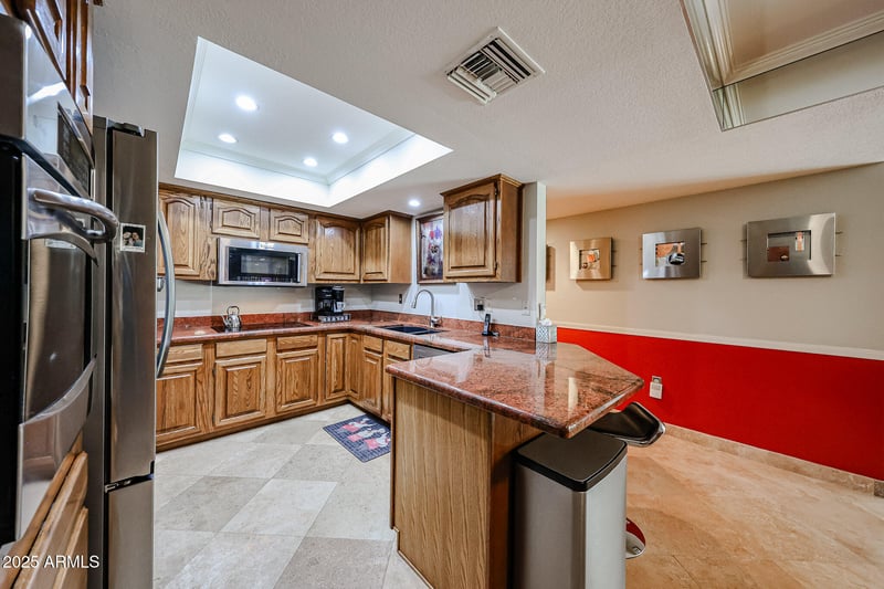 Listing details for 17404 99th Ave #138, Sun, AZ 85373 : *Stunning courtyard ground floor location of this 2 bedrooms, 2 bathrooms with wrap around in this Oasis like living at The Heritage. Travertine floors throughout including shower and closet. Base boards are easy to clean. Top of line appliances including with conduction oven/microwave, induction stove top . ''Red Dragon'' granite countertops in kitchen. Primary bath totally redone with top-of-the-line Kesha Cabinets from Scottsdale (soft close), with Brazilian granite on top of cabinets. Amarine high quality faucets and lighting fixtures, Guest bathroom with upgrade sink and granite countertop. Upgraded Milgard windows and patio door from Lowes, all dual pane with extra thick glass which are a real plus. Exceptionally nice drapes and window cover. Newer A/C good condition from George Brazil. Patio has been totally retiled including separate storage and laundry located off the patio all at the same time, so everything matches. Extra heavy load washer and dry with base drawers. Very low electrical bills.