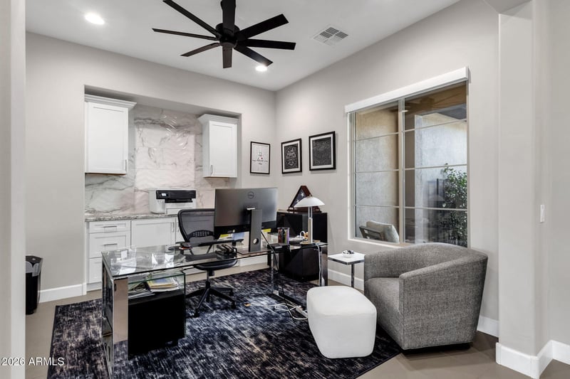 Listing details for 17421 Desert Vista Trl, Rio Verde, AZ 85263 : Guard gated, modern desert luxury with attached casita in Rio Verde (just minutes from nearby, bordering Scottsdale), located in Trilogy at Verde River Golf & Social Club. This single-level Dorado model offers 3 bedrooms, 3.5 bathrooms, + a separate office, + a bonus room off the primary bedroom, with 3,480 sq ft on a rare ~1/3-acre lot!! The owners spent several hundred thousand dollars in backyard upgrades alone including 3,500 sq ft of artistic pavers, luxurious pool & spa, huge ramada with outdoor BBQ kitchen, and raised fire pit sitting area to take advantage of the FOUR PEAKS mountain views. Also, the house is pushed far to the west side of the lot allowing for a large side yard and is the only lot with an HOA approved 10' side RV gate. This lot is ELEVATED and very PRIVATE, as you can't see your neighbors & they can't see you. Situated on a north/south exposure lot bordering a common area, the home features a clean contemporary exterior, paver driveway, and desert landscaping with some natural grass in the backyard. Inside, an open-concept great room floor plan is highlighted by 9+ flat ceilings, no interior steps, expansive ENERGY STAR qualified low-emissivity windows, and abundant natural light. The chef's kitchen includes a large island with seating, custom cabinetry, LEATHERED granite counters, built-in appliances, and a walk-in wine storage feature, flowing seamlessly into the dining area and great room. A built-in library bookcase adds character and functionality. The primary suite offers a spacious retreat with direct outdoor access and a spa-style bath. The attached casita includes a private bedroom, full bathroom, sitting area, and kitchenette, ideal for guests, multi-generational living, or flexible use. An additional den/office offers a dedicated workspace or flex room. Located within a gated golf community with access to biking and walking paths, clubhouse, community spa and heated spa, tennis courts, pickleball, workout facility, and concierge services. Nearby access to Tonto National Forest (1.3 miles), Needle Rock Recreation Area (4.6 miles), and McDowell Mountain Regional Park (8.4 miles) offers hiking, biking, and outdoor recreation, with additional golf opportunities at Trilogy Golf Club at Verde River (0.1 miles). Also, within reach of North Scottsdale dining, shopping, and entertainment. A private desert retreat offering modern design, flexible living, and access to golf and the perfect Arizona outdoor lifestyle you've been looking for!