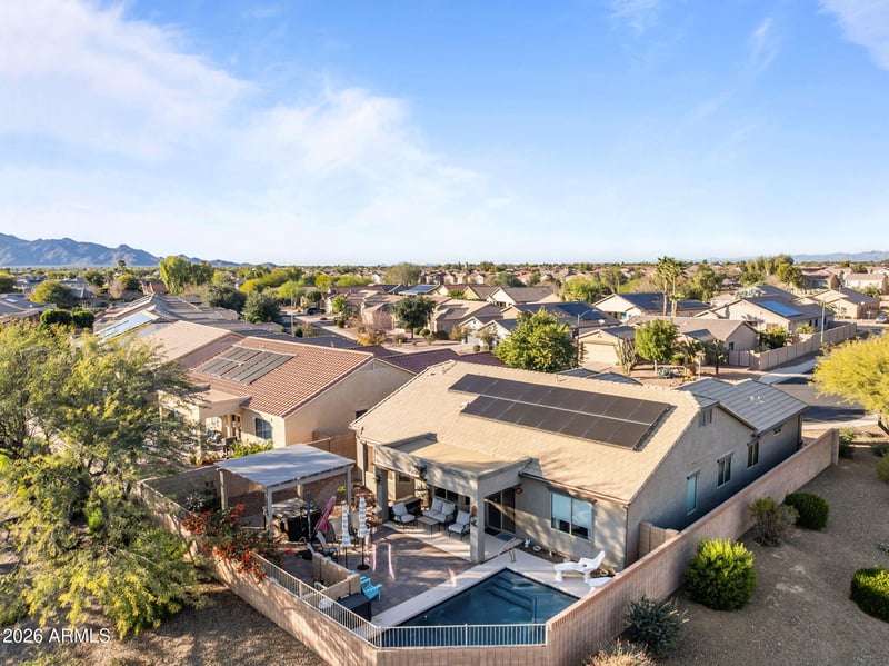 Listing details for 17431 Meadow Ln, Surprise, AZ 85388 : Situated on the desirable west side of the Loop 303 in the sought-after Sierra Montana community, this well-appointed single-level ranch home with 3-car garage and pool, offers 2,194 square feet of thoughtfully designed living space. The open floorplan features four bedrooms, two and a half bathrooms, and a dedicated den/office, providing flexibility for both everyday living and work-from-home needs. The heart of the home is a large eat-in kitchen showcasing granite countertops, stainless steel appliances, and ample cabinetry, seamlessly flowing into a spacious living room ideal for entertaining. New flooring has been installed in all the right areas, enhancing both style and durability throughout the home. You're going to love the primary bedroom, featuring bay windows looking out to your beautifully finished private backyard oasis. The primary bathroom was remodeled in 2022 and features a large walk-in shower and a spacious walk-in closet with custom shelving. Recent major updates add long-term value and peace of mind, including the addition of "owned outright" solar installed in 2018, a roof replacement in 2020 and HVAC system replacement in 2021. Step outside to a private backyard retreat featuring a pool installed in 2024, an above-ground spa, and a view fence that captures beautiful, unobstructed sightline views. The property also offers instant access to the community's bike and walking paths through scenic greenbelts, reinforcing the neighborhood's active lifestyle appeal. Conveniently located near the Loop 303 freeway, shopping, dining, and entertainment, this home combines comfort, functionality, and location in one exceptional package.