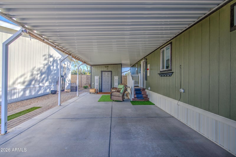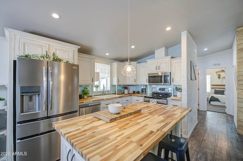Listing details for 17506 Van Buren St #179, Goodyear, AZ 85338 : This charming manufactured home at Cotton Lane, a 55+ lifestyle community features 2 bedrooms and 2 bathrooms, making it the perfect cozy space to relax. Built in 2019 by Cavco, this home has just the right amount of designer touches and a tasteful color palette. Features: vinyl plank flooring and quality carpet in the both bedrooms and living room, stainless appliances, kitchen island, butcher block counters, washer/dryer, ceiling fans, large shed and solar/privacy screens. Furnishings available on separate bill of sale.