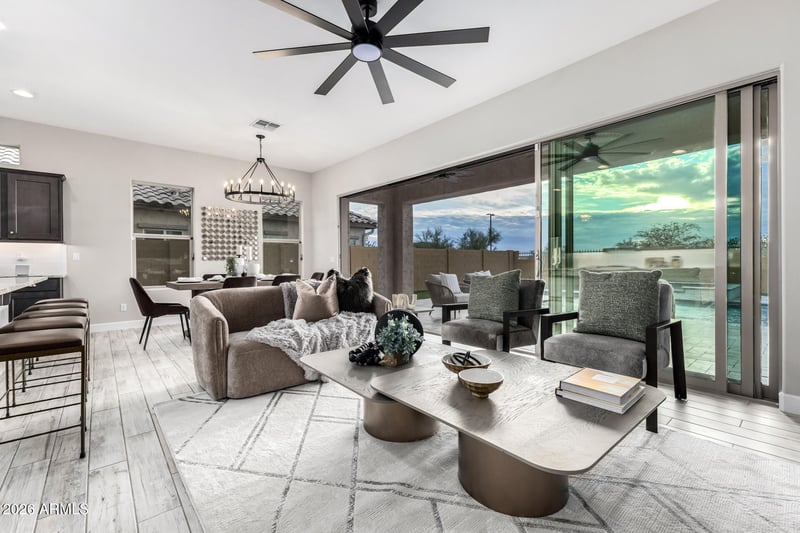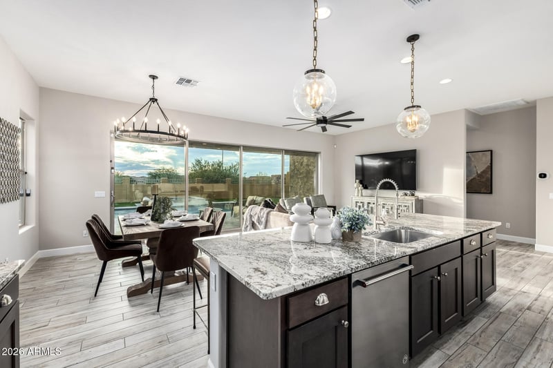 Listing details for 1760 Bernard Cir, Mesa, AZ 85207 : Your dream home is here! This gorgeous 2-bedroom property boasts a 2-car garage, a tasteful paver driveway, and striking stone accents. Fall in love with the captivating open layout showcasing high ceilings, a soothing palette, wood-look flooring, and wide sliding doors that lead to the backyard for seamless indoor-outdoor living. The elegant chef's kitchen boasts granite counters, abundant wood shaker cabinetry with crown molding, SS appliances & an island with a breakfast bar. You'll also find a cozy den ideal for an office or a lounge. The primary bedroom features a lavish ensuite with dual sinks and a walk-in closet. Enjoy enchanting sunsets in the lovely backyard, offering a covered patio, pristine artificial turf, travertine pavers, and a refreshing pool & spa. Make this gem yours!