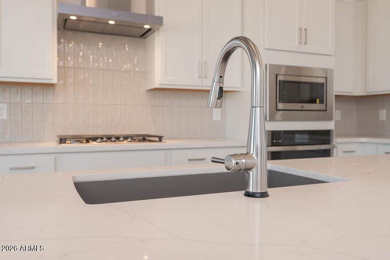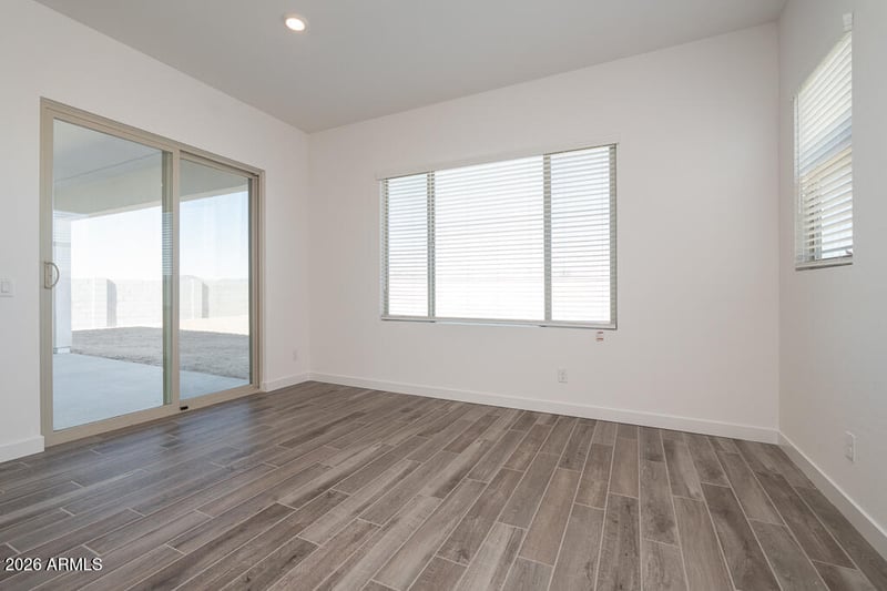 Listing details for 17632 Turney Ave, Goodyear, AZ 85395 : This beautifully upgraded home offers a bright, modern aesthetic with Banton painted White cabinetry and Della Terra quartz countertops anchoring the kitchen. A stunning 16' multi-panel sliding glass door enhances indoor-outdoor living and fills the home with natural light. Tile flooring flows throughout with carpet reserved for the bedrooms only. Bathrooms feature tile tub and shower surrounds, while Snowbound interior paint, 2-panel doors with satin nickel hardware, and interior window blinds add a polished finish. Exterior highlights include pavers at the front porch, an upgraded 8' gate in lieu of standard, a gas stub for BBQ, and a soft water loop—delivering comfort, style, and functionality throughout.