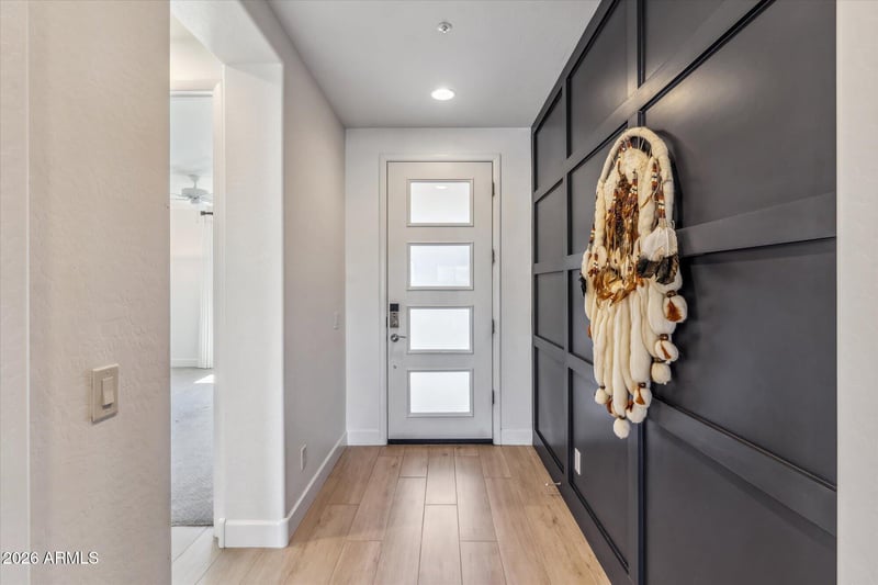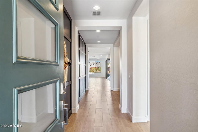 Quality craftsmanship is evident in the 8-foot solid core doors with brushed nickel hardware and the recently painted walls, highlighted by an elegant feature wall at the entrance. The oversized garage includes a 4-foot extension, epoxy flooring, a side entry, and exterior storage. Smart home features include an advanced water filtration system.