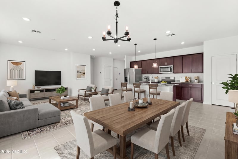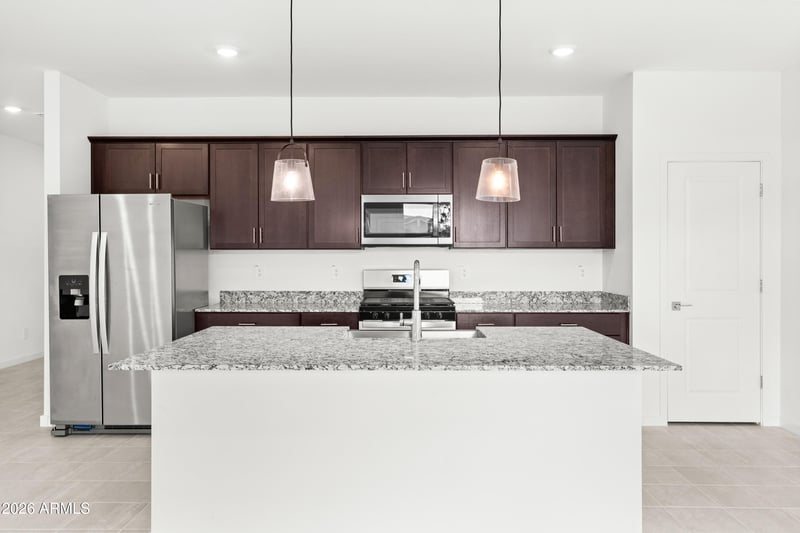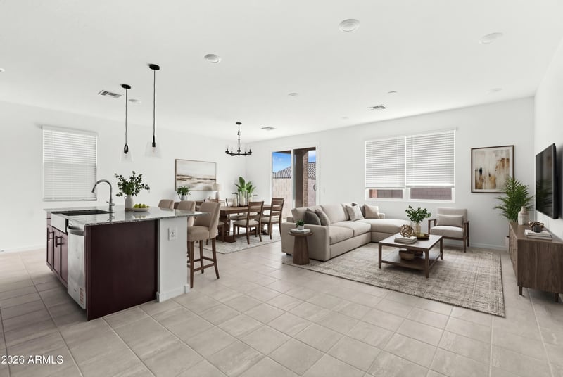Listing details for 17709 Ford St, Goodyear, AZ 85338 : Located in the gated community of Silva Farms, this 2025 Meritage Homes residence showcases the Cedar floor plan with 3 beds/2 bath, at 1,526 sqft. of thoughtfully designed, single-story living. A bright, open layout connects the kitchen, dining, and living areas, creating an easy flow for everyday living and entertaining. Sliding glass doors invite natural light and open to the backyard, extending the living space outdoors. Light, neutral tile flooring runs throughout the main areas, complemented by carpeted bedrooms. The kitchen features rich umber cabinetry, white + grey granite countertops, SS appliances, and a spacious island with breakfast bar seating. The backyard offers a true blank canvas, ready for a personalized outdoor vision, and includes a covered patio perfect for........ relaxing or entertaining. Additional highlights include a 2-car garage with epoxy floors and energy-efficient features such as dual-pane ENERGY STAR qualified windows + ENERGY STAR rated heating and cooling.