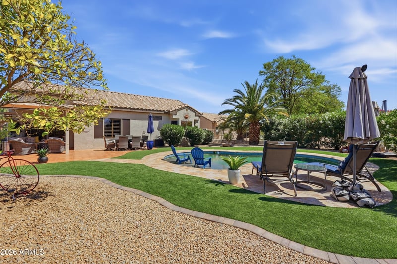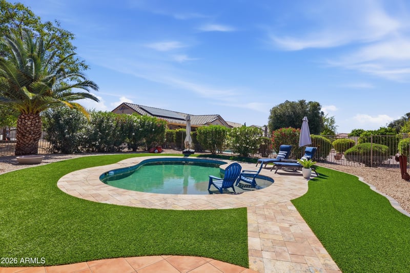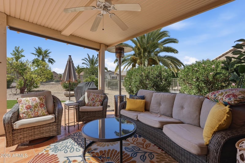 Listing details for 17724 Sundown Ct, Surprise, AZ 85374 : Backyard resort-style living awaits with a stunning pool installed in January 2023, complete with a relaxing sunshelf, extended covered patio with tile flooring, fragrant lemon tree, and lush greenery--perfect for entertaining or enjoying peaceful Arizona evenings. This beautifully maintained home sits on a quiet cul-de-sac and offers outstanding curb appeal with low-maintenance landscaping, charming front patio, and a 2-car garage with built-in storage. Inside, you'll find tile flooring, custom paint, plantation shutters, recessed lighting, and a bright living room that flows seamlessly into the dining area, creating a comfortable and inviting atmosphere. The kitchen features ample white cabinetry, tile backsplash, and a cozy breakfast nook ideal for casual dining. The spacious primary suite includes a bay window, walk-in closet, and private bathroom. Located in a prestigious 55+ community offering golf, clubhouse, fitness center, pool, sports courts, restaurants, and close proximity to shopping and everyday conveniences. This is Arizona living at its finest -- don't miss this exceptional opportunity.