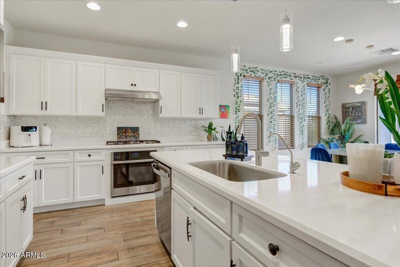 Listing details for 17733 Bear Wallow Way, Rio Verde, AZ 85263 : Welcome to your dream home with stunning Four Peaks Views at Trilogy at Verde River--a beautifully upgraded Acacia residence showcasing timeless curb appeal with a two-car garage, elegant paver drive, new fencing, and manicured artificial turf. Inside, the airy Great Room is filled with natural light featuring a designer palette, a custom feature wall, and upgraded wood-look flooring. Designed for both entertaining and everyday comfort, the chef's kitchen features quartz countertops, a reverse-osmosis system, white shaker cabinetry with crown molding, designer tile backsplash, pendant and recessed lighting, stainless steel appliances, a custom walk-in pantry, and an oversized island with breakfast bar seating. A versatile den is ideal for a home office or study. The spacious primary suite offers a spa-inspired bath with dual vanities and a walk-in closet. Outdoors, enjoy a covered patio and ramada, a renovated built-in BBQ, and captivating Four Peaks views. Additional upgrades include a water softener, automatic irrigation front and back and custom landscaping.
