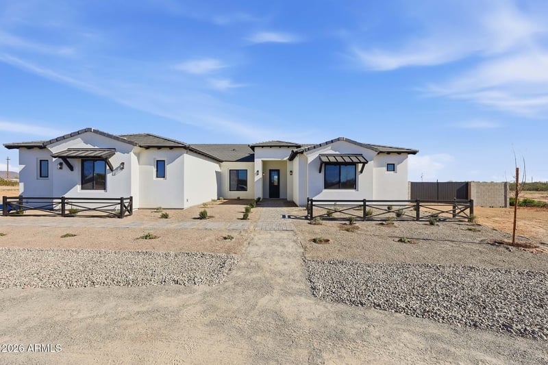 Listing details for 17743 Dale Ln, Surprise, AZ 85387 : Stunning modern farmhouse on just over an acre, featuring 3,200 sq ft, 4 bedrooms, den/office, flex space ideal for next-gen or attached casita with separate front entry, 3.5 baths, and a 3-car garage. White and white-oak cabinetry throughout, with black and gold fixtures and floor-to-ceiling tile in all full baths. Split floorplan offers efficiency and privacy. Energy-efficient 2x6 construction with spray foam insulation, dual A/C units, electric cooktop, and appliances. Paver driveway, patios, and walkways, circular drive off private crushed asphalt millings, two RV gates, block wall enclosure, soft water loop, holiday light outlets, garage octagon lighting, added cabinetry with mini fridge, vertical septic for future pool, casita, or RV garage.