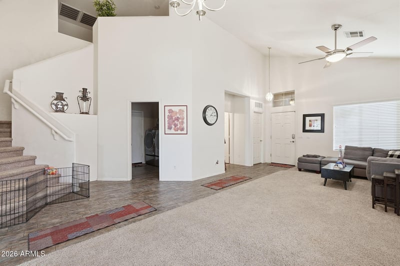 Step inside to a bright, airy living room highlighted by vaulted ceilings, wood-look tile flooring, and soft neutral palette that creates a warm and welcoming feel.