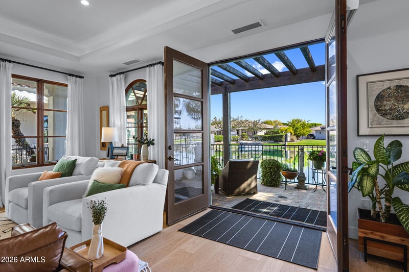 Listing details for 1777 Ocotillo Rd #16, Chandler, AZ 85248 : Elegance is redefined in this exquisitely renovated WATERFRONT residence in the prestigious gated Villas at Ocotillo. Perfectly positioned to capture sweeping, uninterrupted water views, this home offers a rare blend of refined design and serene lakeside living. Thoughtfully updated throughout, the property features three expansive owner suites, each appointed with a private bath and generous walk-in closets, ensuring exceptional comfort and privacy for both residents and guests. Two luxurious suites are conveniently located on the main level, while the upstairs retreat offers elevated, panoramic views of the tranquil waterfront, creating a true sanctuary. The gourmet kitchen is a showcase of fine detail, boasting granite countertops, custom cabinetry, premium appliances, a gas range and an abundance of pantry storage. In addition to the stunning living spaces, the main level features a bright, private office/den at the front of the home, making it ideal for remote work, study, or a quiet retreat. A conveniently located half bath is also on the main floor, which enhances functionality for everyday living. Entertaining becomes unforgettable as the dining space overlooks the shimmering water, setting the stage for both intimate dinners and grand gatherings. The expansive wrap-around patio offers the perfect setting to unwind or host guests, all while taking in the peaceful waterfront views. Located in a small, exclusive gated community with a heated pool and spa, this exceptional home offers a refined lifestyle centered around comfort, privacy, and stunning waterfront views. Zoned for top-rated Chandler Unified School District schools and just minutes from Ocotillo Golf Club and Intel in the thriving Price Corridor, the location perfectly balances everyday convenience with an elevated lifestyle. Enjoy premier shopping, dining, and entertainment at Ocotillo Plaza and Downtown Chandler, all with quick access to the Loop 101 and Loop 202 freeways.