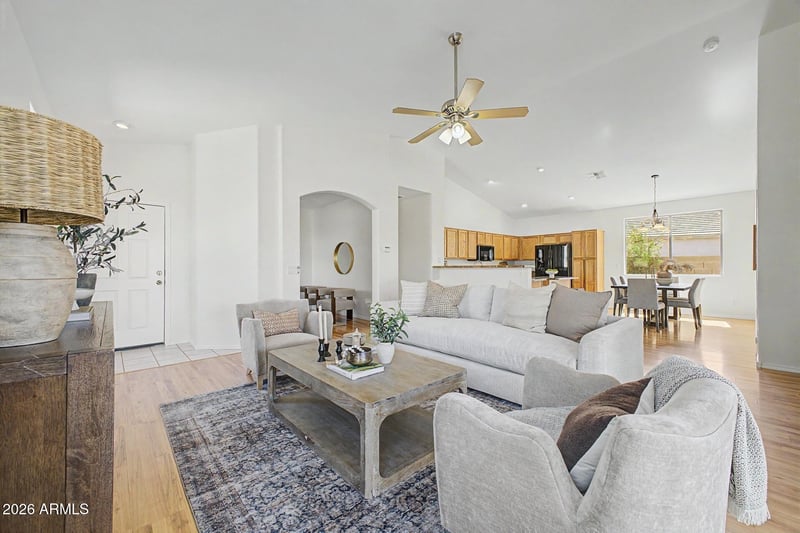 Inside, vaulted ceilings and an open floor plan create a light and bright atmosphere from the moment you walk in. Fresh interior and exterior paint plus a new garage door make this home truly move-in ready -- and the refrigerator, washer, and dryer are all included.