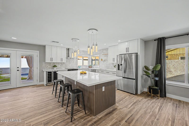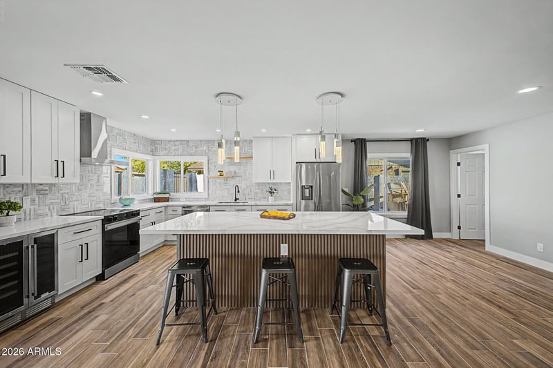 Listing details for 17819 57th Dr, Glendale, AZ 85308 : Stunning Designer Remodeled single level home with no HOA! Inside, you'll find a perfect blend of style and comfort, featuring wood-look flooring, large open layout, designer lighting, chic accent walls, and a neutral palette. The great room boasts a custom fireplace with gorgeous tiles, while the pristine kitchen comes equipped with white shaker cabinets, designer tile backsplash, quartz countertops, built-in appliances, wine cooler and an island, perfect for those casual conversations and quick bites. 4 large bedrooms, gorgeous designer bathrooms with plenty of space to unwind. Gorgeous backyard with a large covered patio, a built-in BBQ, perfect for gatherings, artificial turf, and a refreshing pool to enjoy the AZ weather! Huge side yard with a full size RV gate to park toys. Highly desirable area! You will not find anything like it. Come see it today!