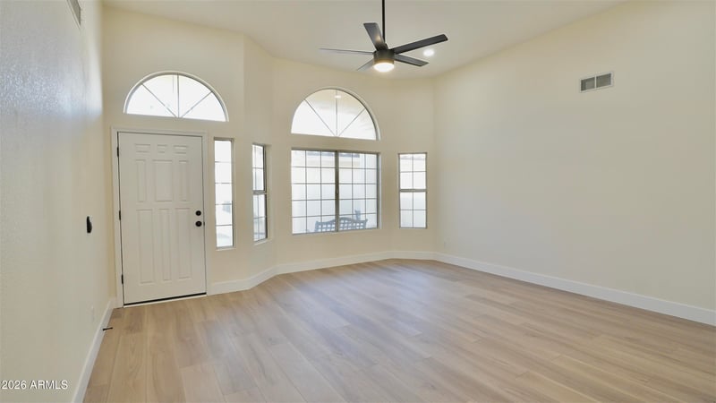 Listing details for 17865 Desert Flower Trl, Surprise, AZ 85374 : MOTIVATED SELLER! Seller willing to assist with buyer concessions with a full-price offer! Welcome home to Sun Village, where charm and comfort meet. From the inviting front porch to the separate guest quarters, RV gate, and low-maintenance desert landscaping, this property makes a wonderful first impression. Inside, fresh paint, upgraded LVP flooring, vaulted ceilings, and recessed lighting in the living and family rooms create a bright, open feel. The split floor plan offers privacy and flexibility with additional square footage to enjoy. The kitchen shines with stainless steel appliances, quartz countertops, and a decorative backsplash that adds style and character. Relax in the screened Arizona room overlooking the oversized 13,500 sq ft corner lot. Roof underlayment replaced in 2022 for peace of mind.