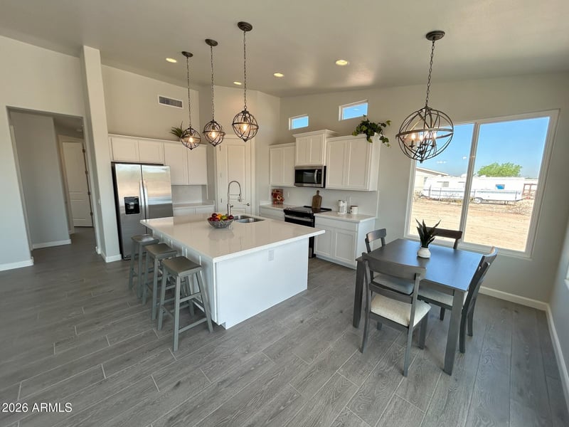 Listing details for 17885 Stonebluff Rd, Maricopa, AZ 85139 : This beautifully crafted 3-bedroom, 2-bath custom home offers 1,658 square feet of thoughtfully designed living space, and a spacious 2 car (9-ft height) garage, situated on a 1.7-acre horse property with breathtaking mountain views and NO HOA.Inside, you'll find soaring vaulted ceilings in the great room, kitchen, dining area, and foyer, with 9-foot ceilings throughout the remainder of the home, creating an open and airy feel. The kitchen is both stylish and functional, featuring white shaker cabinets, solid surface quartz countertops, an undermount single-basin sink with a gourmet faucet, stainless steel appliances, and a corner pantry with high windows that flood the space with natural light.Upgraded wood-plank ceramic tile flows seamlessly throughout the home, complemented by 4ΒΌ" baseboards and elegant two-panel square raised 8-foot doors. The spacious primary and hall bathrooms showcase upgraded tile surrounds at the tub and shower areas.Additional highlights include ceiling fans in all bedrooms and the great room, dual-pane energy-efficient windows, and a covered patio with recessed lighting--perfect for enjoying the peaceful surroundings and stunning views.Experience the freedom of wide-open space combined with modern comfort and quality craftsmanship in this exceptional property.
