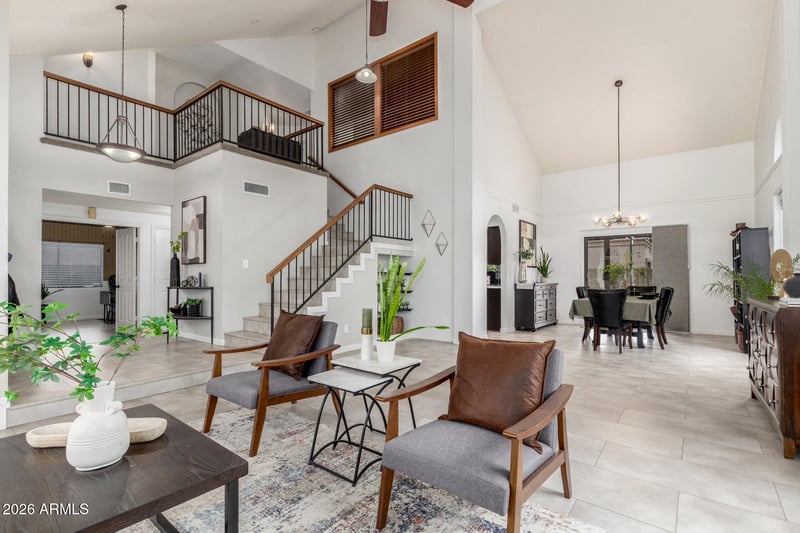 The home's impressive 20-foot vaulted ceilings and open floorplan create a bright, airy atmosphere that feels both spacious and inviting. With 4 generous bedrooms plus a versatile office/den, there's room for everyone. The oversized master suite is a true retreat, featuring walk-in closet and a spa-like bathroom with a separate soaking tub framed by a bay window.