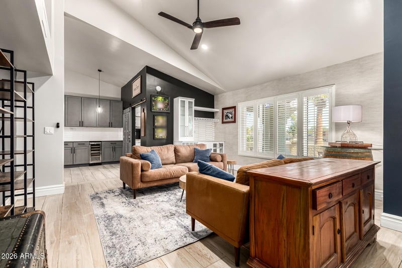 Listing details for 18008 75th Ave, Glendale, AZ 85308 : Beautifully remodeled luxury home featuring a designer kitchen with quartz countertops and premium flooring throughout. This inviting residence offers a stunning wood-burning fireplace, soaring vaulted ceilings, and a small loft up the spiral staircase, perfect for a private study, a fun space for kids, or a home office. The spacious primary suite includes a walk-in closet, while the resort-style backyard showcases a sparkling pool, mature landscaping, and a desirable large corner lot.