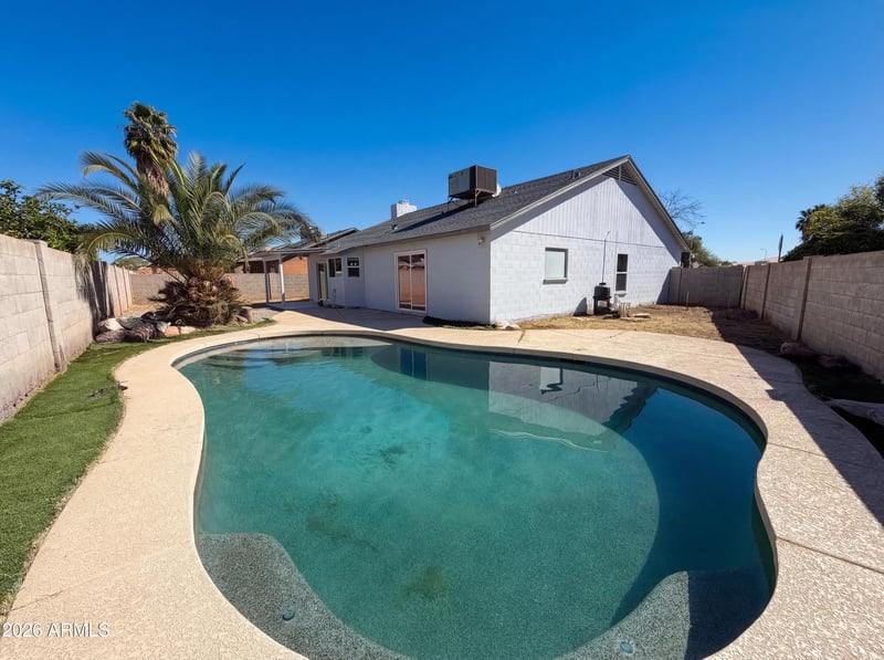 Listing details for 1802 89th Ave, Phoenix, AZ 85037 : Explore what awaits at 1802 N 89th Ave, where the kitchen includes stainless steel appliances. The living area features a fireplace, while the primary bathroom contains double sinks. The primary bedroom provides a walk in closet. Outside, the property presents a private in ground pool, a covered patio, and a fenced in backyard. The interior includes partial flooring replacement. This residence is complete.. Included 100-Day Home Warranty with buyer activation