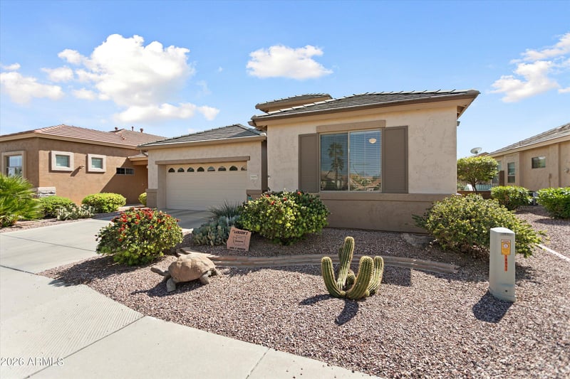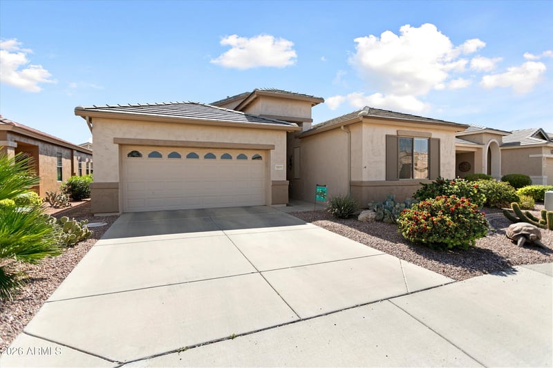 Listing details for 18051 Browning Dr, Surprise, AZ 85374 : This special home is nestled on a South facing fully fenced lot in 55+ guard gated Arizona Traditions resort! The home offers an open great rm w/living, dining and kitchen combination w/vaulted ceilings! The pretty island kitchen has rich GRANITE counters, cherry cabs, newer SS appls inc french door refrig! The two bedrms are split providing privacy for both! Primary retreat has extended bay, ensuite bath w/dual sinks, step in shower & walkin closet! Den or office provides a multitude of uses! If you like to entertain or BBQ, here you can do both! The built-in BBQ island has a gas firepit, and the full covered patio has an extension providing extra shade! The yard is fully fenced w/iron fencing at sides & two gates! Plus NEW ROOF UNDERLAYMENT INSTALLED 2020! You need to see this home now!