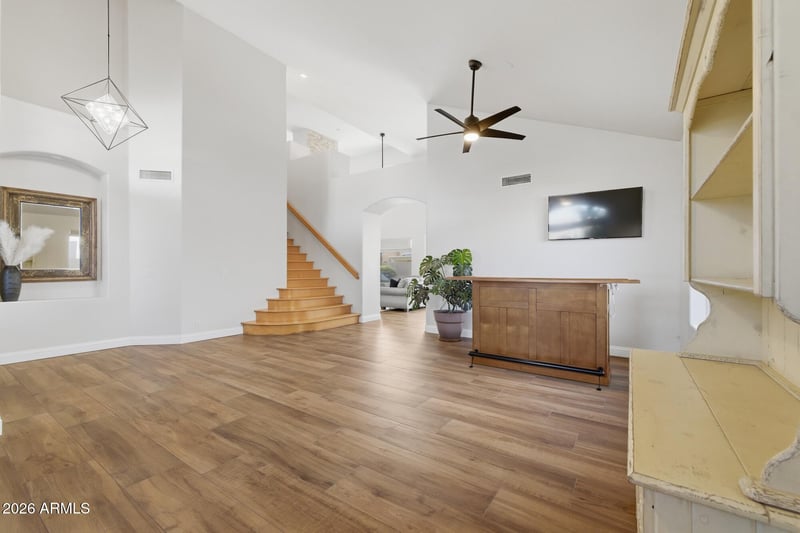 With 5 bedrooms, 2.5 bathrooms, and a downstairs primary suite, 1811 W Wisteria Dr features vaulted ceilings, a floor-to-ceiling stone fireplace with built-ins, high-end large-format wood-look tile, a bright open living area, large kitchen island, 2 new AC units, a private pool and a 3 car garage!