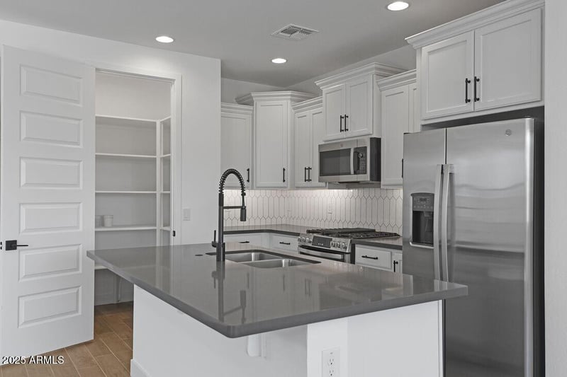 Listing details for 18126 Hiddenview Dr, Goodyear, AZ 85338 : New Construction - Ready Now! Built by America's Most Trusted Homebuilder. Welcome to the Dolce at 18126 W Hiddenview at CantaMia. This 2-bedroom plus den, 2-bath floor plan offers a bright and open layout that's perfect for both everyday living and entertaining. The upgraded kitchen features 42'' staggered cabinets, a spacious island with bar seating, a walk-in pantry, and effortless flow into the dining area, great room, and covered patio—ideal for seamless indoor-outdoor living. The private owner's suite is tucked away at the back of the home, while the guest bedroom is conveniently located near the foyer for added comfort. A 4' garage extension provides extra storage and versatility. Virtually staged photos. MLS#6831956 This home has an appliance package that includes the refridgerator, front load washer and dryer. Structural options added include: paver front porch and driveway, 8' interior doors, 4' garage extension.