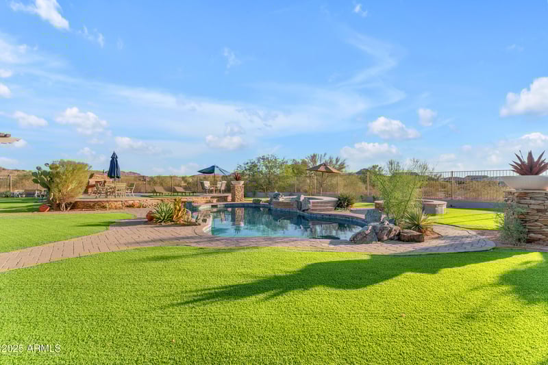 Listing details for 18199 Buckhorn Dr, Goodyear, AZ 85338 : Welcome to your new home located in Gated golf course community with double Oversized Premium LOT with beautiful views, in Estrella Mountain Ranch! This 4 bed, 2 bath home has a great open layout that's perfect for gathering with friends and family. The kitchen has tons of storage, granite counters, gas cooktop, big island with seating, wine fridge, and a walk-in pantry. You'll love how it opens right up to the living room with lots of natural light and space to relax. The primary suite has a large bathroom with double sinks, soaking tub, walk-in shower, and a big closet. Step outside to your own backyard getaway-- with a covered patio, low-maintenance turf, pavers, built-in spa, and a sparkling pool surrounded by custom landscaping. A great spot to enjoy the Arizona sunsets! 3 car garage Location, Location Location is Amazing....!!!!!!! HUGE semi custom lot feels like your very own Resort in your backyard! Estrella MTN Ranch amenities Community Centers with pools water slides, heated lap poos, play pool, work out facility GYM facilities, Catch and Release fishing, kayaks, paddle boats, over 50 miles of hiking biking trails & much much more. Nicholas design golf course of Estrella is Top Notch managed by Troon.