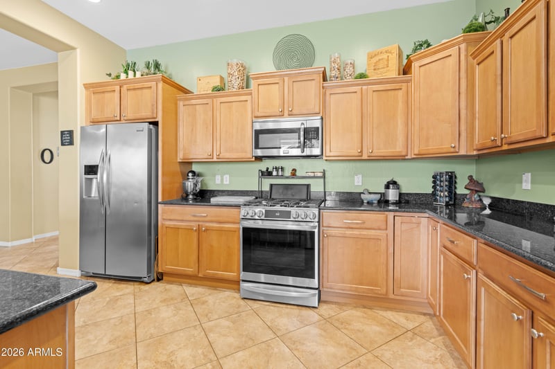 Listing details for 18226 El Caminito Dr, Waddell, AZ 85355 : Immaculate single-level 3BD/2BA with open-concept layout, granite kitchen, island, staggered cabinets & stainless appliances. 10' ceilings, 8' doors, diagonal tile & neutral tones throughout. Spacious primary suite with dual sinks & separate tub/shower. Backyard oasis with sparkling pool, pergola & mature landscaping. 3-car garage with epoxy floors & storage. Move-in ready!