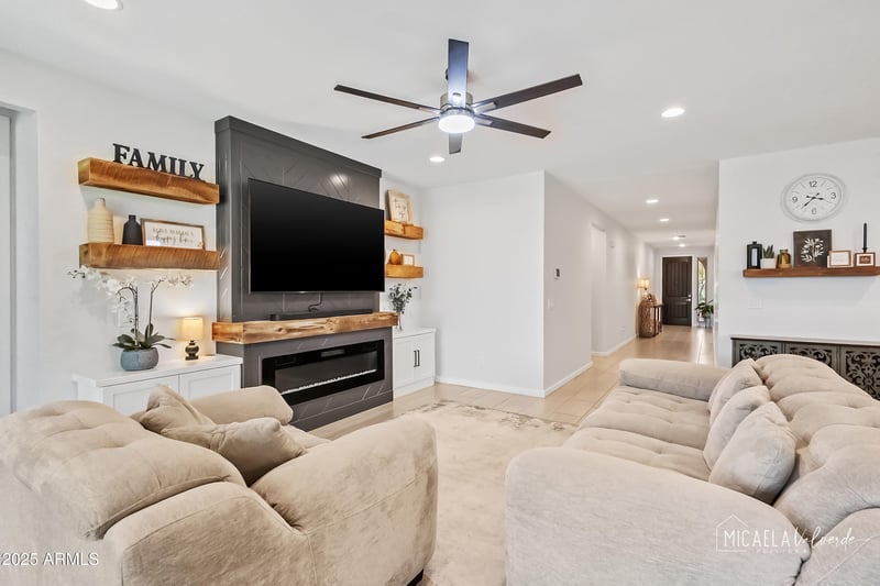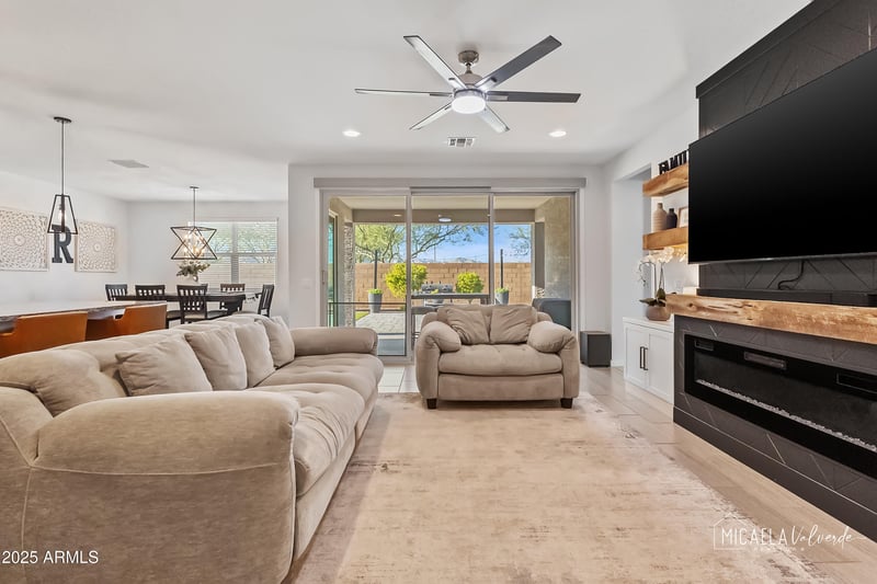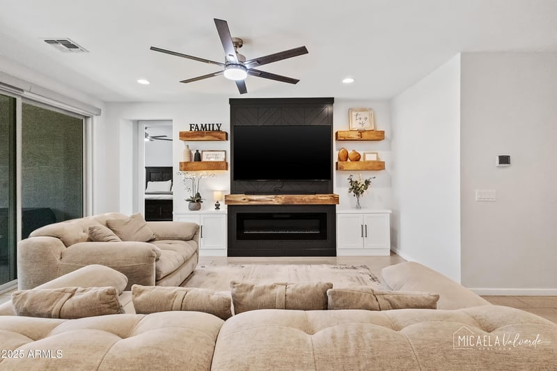 Listing details for 18244 College Dr, Goodyear, AZ 85395 : This beautiful 5-bedroom, 3 bath home is stunning and shows like a model! Sought after area in the West Valley, gated community, minutes to everything...Freeways, Shopping, Dining and Hiking. Park your Toys behind the 14' RV gate...the HOA allows it! Over 1/4 of an Acre lot that is nicely landscaped, but also ready to make yours. Open feel, lots of storage and a great layout. The 5th bedroom and full bathroom area is ideal space for the In-laws, Guests or Adult children. All the doors are painted black, which add a nice, luxurious touch. The built-in Wall Unit/Fireplace are a lovely addition to the Living Room. And the glass slider...picture it open during the cooler months while entertaining your friends and family. Come see this one for yourself...the pride of ownership shows!