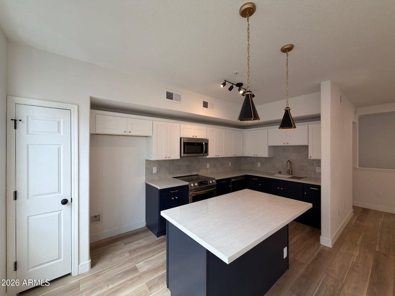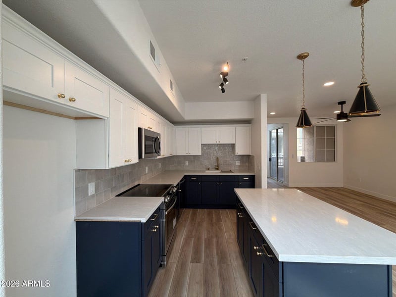 Listing details for 18250 Cave Creek Rd #161, Phoenix, AZ 85032 : Beautifully remodeled townhome featuring high-end finishes and contemporary design throughout. The kitchen showcases stainless steel appliances, two-tone shaker cabinetry, quartz countertops, and a convenient breakfast bar. Modern lighting fixtures and vinyl wood flooring create a bright, open flow throughout the home. The bathrooms are thoughtfully updated with premium shower system, custom vanities, framed mirrors, and designer tile niches. Residents enjoy access to community amenities, including a heated spa and sparkling swimming pool.