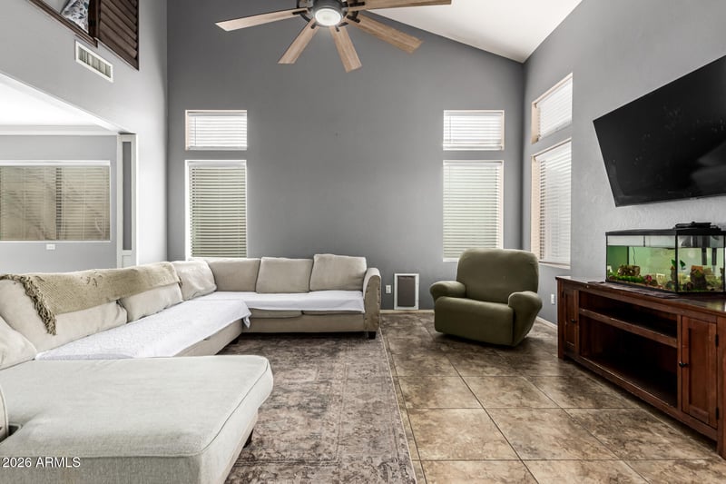 Listing details for 1828 238th Ln, Buckeye, AZ 85326 : Bathed in natural light, this beautifully designed home welcomes you with soaring vaulted ceilings and expansive windows that create an airy, open feel throughout the day. The heart of the home is the eat-in kitchen, thoughtfully appointed with stainless steel appliances, a center island, and a breakfast bar—perfect for casual mornings or entertaining guests.