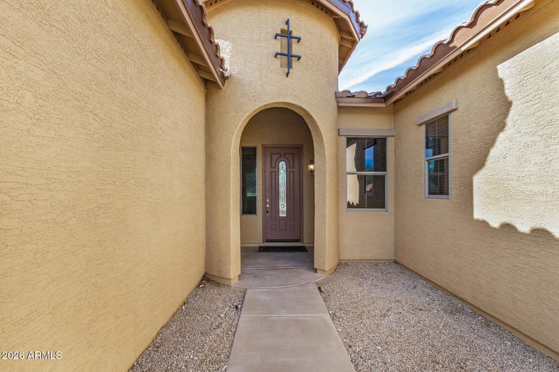 Step outside through sliding glass doors from dual points of entry to a resort-style backyard with a view fence, Pebble Tec pool, fire pit, flagstone paversall framed by desert wash and spectacular sunsets.