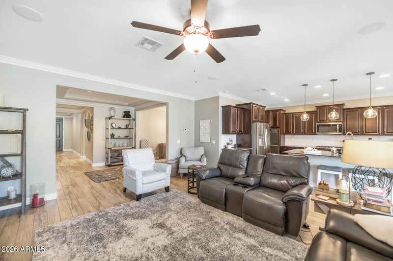 Listing details for 18340 Onyx Ave, Waddell, AZ 85355 : Designer updated home features Gourmet kitchen, stainless steel appliances, double ovens, gas range, granite island, upgraded backsplash, butler pantry & oversized walk-in pantry. Primary suite with oversized walk-in shower, quartz counters, & custom built-in closet system. All secondary bedrooms are generously sized & have walk-in closets. Additional features include, solar tubes, faux wood blinds, ceiling fans, Plus, Wood-like plank tile flooring, crown molding, & statement lighting fixtures. Private Sparkling HEATED POOL, expansive travertine paver patio, & low-maintenance synthetic grass. Ample parking with the 3-car tandem garage, RV gate, & off street extended paver driveway. Located in sought-after Cortessa community with parks, sports courts, picnic areas, and Dysart SD