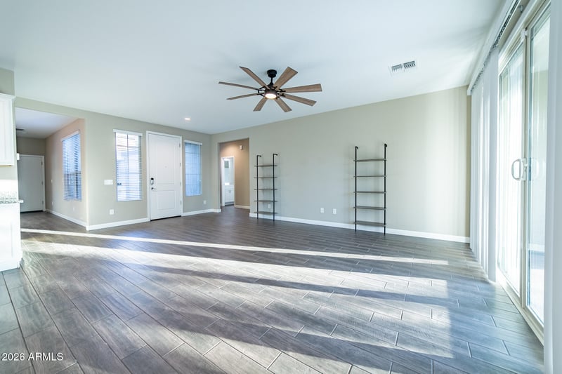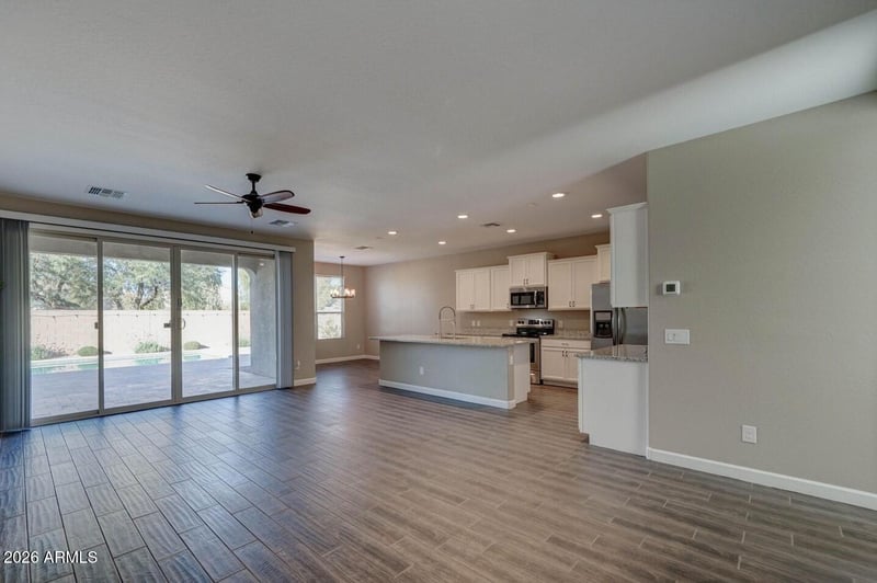 Listing details for 18350 Arbor Dr, Maricopa, AZ 85138 : From the moment you arrive, you'll love the curb appeal and gated courtyard entry. Inside features wood-look tile plank flooring and a bright, open great-room layout. The kitchen shines with crisp white cabinets, a large island, granite counters, stainless appliances, and a spacious pantry—ideal for daily living and entertaining.