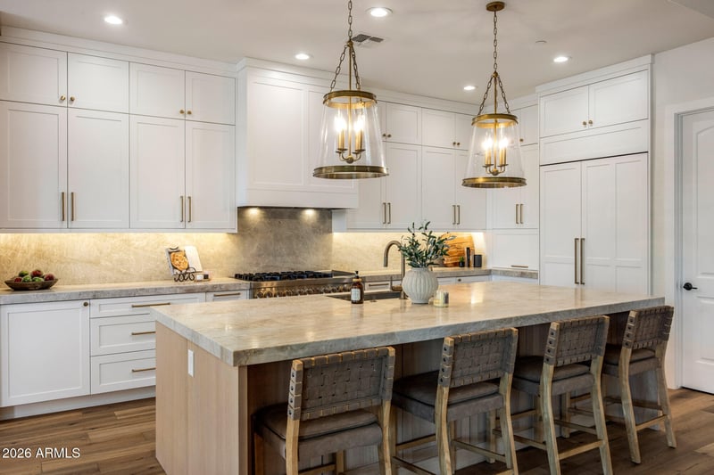 Listing details for 18378 96th Way, Scottsdale, AZ 85255 : Sophisticated luxury living awaits in guard-gated Windgate Ranch, offering the coveted North Scottsdale lifestyle in a community with resort amenities, McDowell Sonoran Preserve access and city convenience. Remodeled in 2025, this Toll Brothers single-level Villaga design is set on a premium homesite backing to desert preserve, capturing tranquil privacy and mountain views. Inside, the refreshed interior is light, clean and contemporary - featuring new hardwood flooring throughout the main living areas, new wide plank baseboards, designer lighting, and a freshly painted neutral palette that complements any style. The spacious great room is anchored by a custom built-in media wall, ideal for entertainment, storage and showcasing collections. Entertaining continues in the fully remodeled chef's kitchen, complete with an expansive stone island with seating, premium appliances, new Shaker cabinetry with modern hardware, and beautifully coordinated stone counters and backsplash. A new custom dry bar adds a polished touch with glass display cabinetry, beverage refrigerators, and illuminated floating shelves set against a dramatic stone backdrop. The flexible split plan offers a pair of guest suites with Jack-n-Jill bathroom, thoughtfully separated from the primary suite - an inviting retreat with dual walk-in closets, dual vanities, a dressing station and a spa-worthy oversized shower featuring dual rain showerheads. A fourth ensuite bedroom is tucked near the primary while still offering privacy, perfect as a guest room or dedicated office. Designed for seamless indoor/outdoor living, a dramatic 3-panel stacking slider from the great room disappears to the covered patio and reveals an extraordinary backyard. The resort-style setting is anchored by a heated Pebbletec pool with sun shelf and an elevated spillover spa, accented by two glass fire bowls with water features for a true luxury-hotel ambiance. Multiple gathering spaces include a covered pergola with built-in barbeque, raised travertine firepit lounge, sun and shade seating areas and a 3-hole putting green. An electronic roll-down sunscreen extends the patio experience, while the west-facing orientation delivers unforgettable Arizona sunsets and striking mountain views. Come enjoy the North Scottsdale lifestyle in an active community with multiple pools, tennis, pickleball, basketball, playgrounds, clubhouse and miles of nearby trails, plus quick access to the Loop 101, premier shopping, dining and top-rated schools. Move-in ready, remodeled and perfectly positioned for the very best experience.