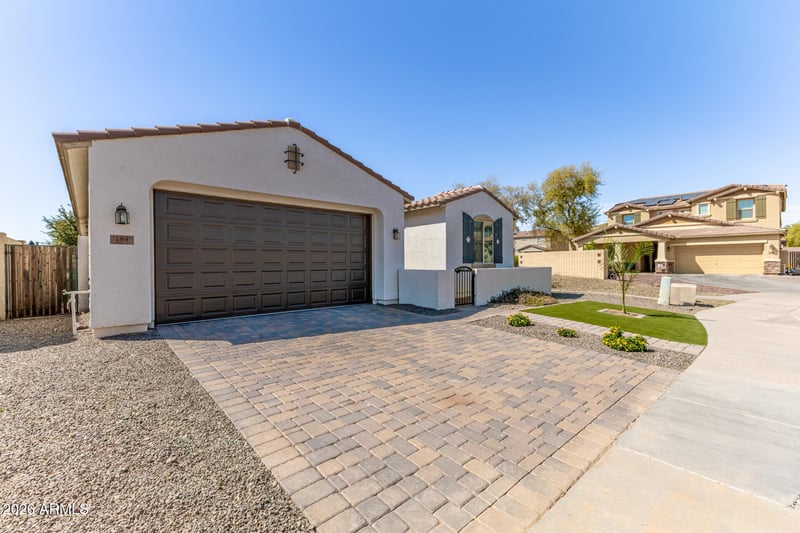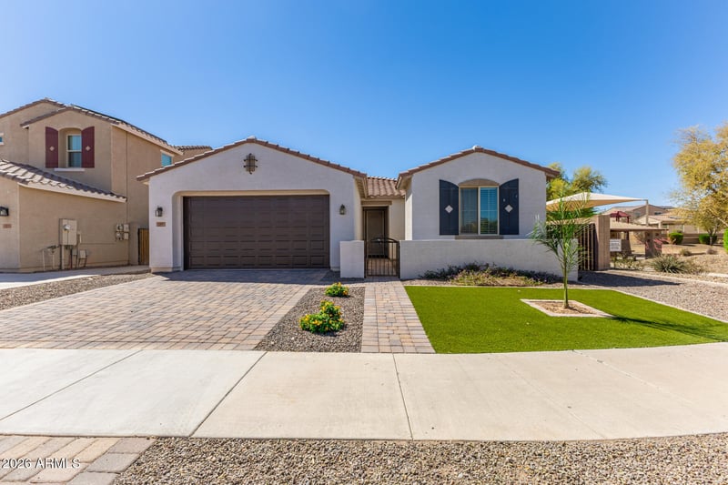 Listing details for 184 169th Ave, Goodyear, AZ 85338 : Beautiful home awaits you here in Canyon Trails! Displaying a delightful landscape and a 3-car tandem garage w/paver driveway. The interior showcases tons of natural light, a neutral palette, and wood-look tile flooring w/soft carpet in bedrooms. You'll love the spacious open layout with multi-sliding doors to the back! The impressive kitchen boasts SS appliances, granite counters, staggered espresso cabinets, recessed lighting, and an island w/breakfast bar. The double-door den can be an office. The large main bedroom has an ensuite that features dual sinks, a walk-in closet, and a shower w/dry-off area. Have a fun gathering in the backyard with a covered patio, artificial turf, well-laid pavers, & a Gazebo! The view fence opens to a tranquil common area, with no rear neighbors. Just WOW!