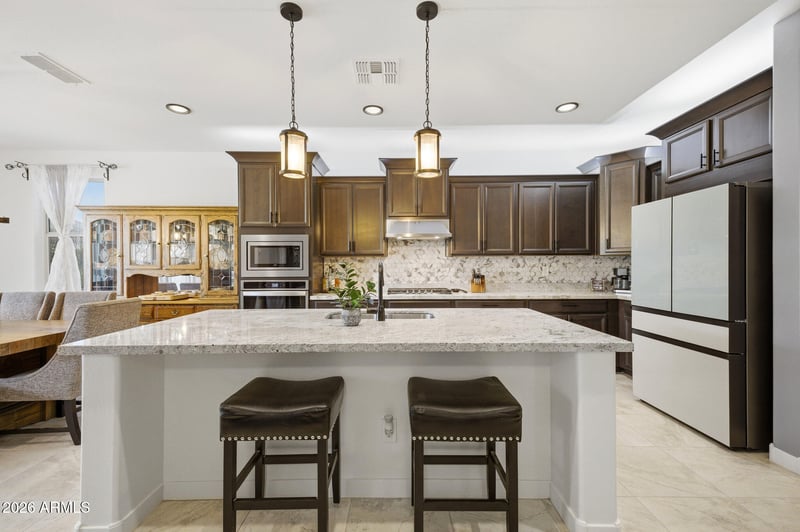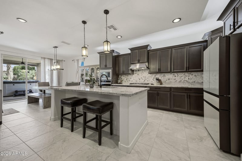 Listing details for 18406 Highland Ave, Goodyear, AZ 85395 : Welcome to your own private resort in Goodyear! This exceptional home showcases a true backyard oasis with lush landscaping, mature trees, and a dedicated citrus tree area, creating a peaceful, private escape. Enjoy a sparkling pool, above-ground jacuzzi, tranquil koi pond with waterfall, and a cozy firepit perfect for Arizona evenings. The custom outdoor kitchen is an entertainer's dream, featuring a built-in grill, griddle, smoker, sink, wine bar, and kegerator for next-level hosting.