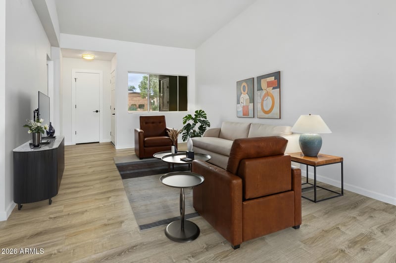 Listing details for 18415 Mica Dr, Sun City West, AZ 85375 : Turnkey, fully remodeled living in the heart of Sun City West - this lock-and-leave townhome is perfectly designed for seasonal escapes or full-time retirement comfort. Enjoy a low-maintenance lifestyle where every detail has already been upgraded. Spend your mornings on the private courtyard, afternoons on the golf course or at the pool, & evenings in a beautifully refreshed home that feels brand new. Whether you're a winter visitor or settling into full-time retirement, this home delivers ease, comfort, & community. Completely remodeled throughout, the home features new laminate flooring, updated baseboards, & fresh interior paint. The designer kitchen shines with white cabinetry, black hardware, quartz countertops, & stainless steel appliances--plus refrigerator, washer, & dryer convey. The open living room is elevated by vaulted ceilings and double French doors that lead to a private courtyard, creating seamless indoor-outdoor flow. Both the primary suite and guest bath have been fully remodeled with quartz vanities and beautifully tiled walk-in shower/bath combo. Bedrooms include blackout honeycomb cellular shades for comfort and privacy. Private back courtyard with space and access for golf cart parking, plus a 1.5-car garage offering ample storage. Experience the best of Sun City West living in a fully updated, move-in-ready home, perfect for your next chapter or winter retreat.