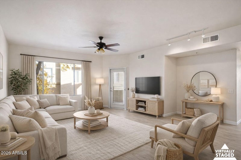 Listing details for 18416 Cave Creek Rd #2069, Phoenix, AZ 85032 : Welcome to this beautifully updated 2-bedroom, 2-bath condo nestled in the gated community in North Phoenix. This desirable second-floor unit offers both privacy and charm, with serene views overlooking the community pool. Inside, you'll find newer, stylish flooring throughout, creating a clean, modern feel that's both inviting and low-maintenance. The unit includes a full size washer and dryer and updated appliances. Perfect as a primary residence, second home, or investment property, this condo combines convenience, comfort, and a resort-style setting with a club house and work out facility on the grounds and nearby the unit.