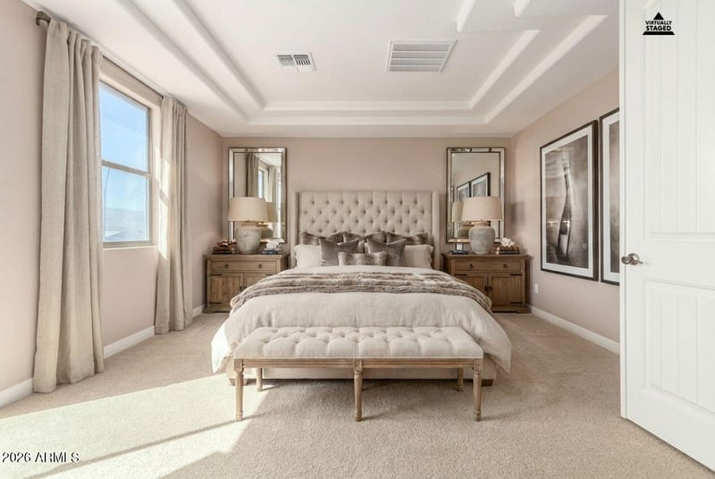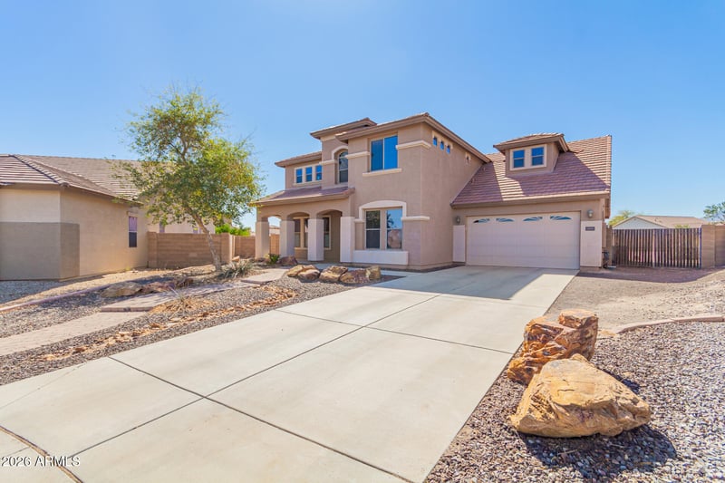 Listing details for 18431 Cinnabar Ave, Waddell, AZ 85355 : Beautiful 5 bed 4 bath home located in the Cortessa community. This property backs to an interior street & has a massive lot size with RV gate & stunning views of the White Tank Mountains. The interior is in pristine condition with a grand entrance, soaring ceilings, unique architecture, 8' interior doors, fireplace & elegant wood spindle staircase railing. Kitchen includes upgraded staggered cabinetry with 42'' uppers, island with counter seating, breakfast nook, granite counters, butler pantry & a large walk-in pantry. Large family room open to kitchen area, 1 bedroom & 1 full bath downstairs, amazing master bedroom with separate tub/shower, huge walk-in closet, covered patio with upper walk deck, 3 car tandem garage with epoxy flooring. Massive backyard ready for your dream design.