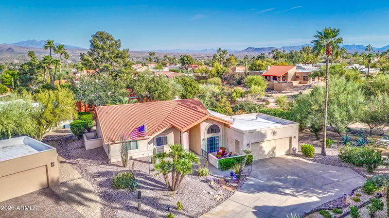 Listing details for 18443 El Cortez Pl, Rio Verde, AZ 85263 : Move-in ready home on a rare, oversized and private cul-de-sac lot in the desirable Rio Verde active adult golf community. This well-maintained 3-bedroom, 2-bath home features vaulted ceilings, a cozy fireplace, and multiple sliding doors leading to a large wraparound covered patio that highlights the exceptionally private lot and outdoor living space. The kitchen includes granite countertops, stainless steel appliances, and a bright breakfast nook with patio access. Recent updates include luxury vinyl plank flooring, updated irrigation, and a newer water heater. The spacious primary suite offers dual sinks, soaking tub, separate shower, and walk-in closet. Located in Rio Verde, northeast of Scottsdale, an active 55+ golf community with abundant clubs, activities, and amenities. See more The expansive wraparound covered patio is a standout feature of the home, creating a wonderful space for outdoor dining, relaxing, and entertaining while enjoying the privacy of the oversized lot. Homes in Rio Verde rarely offer this much outdoor living space combined with such a large and private cul-de-sac lot, making the setting especially peaceful.