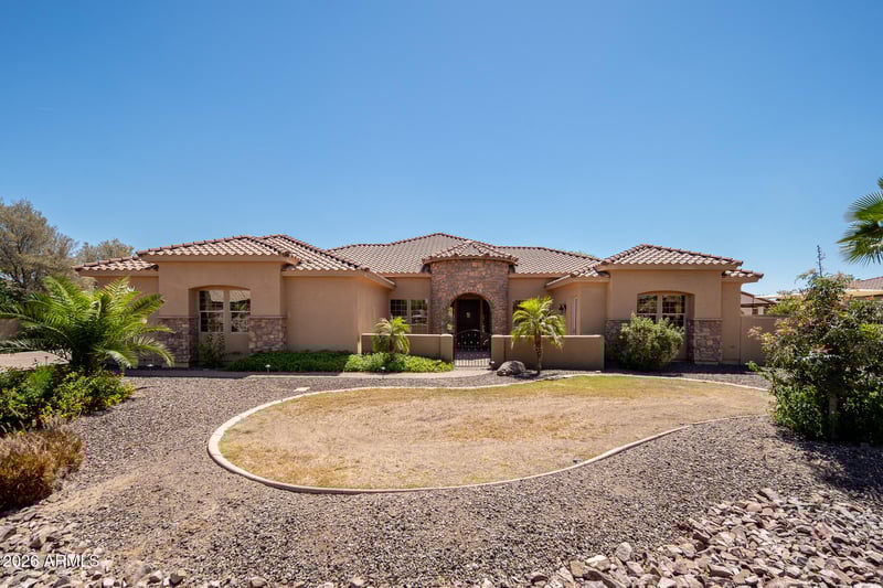 Listing details for 18509 Rancho Ct, Litchfield Park, AZ 85340 : Highly sought after acre lot homes in gated community! Rare oversized detached garage/shop with AC, large RV parking bay and multi car bay with lift. Perfect living and entertaining layout with open great room floor plan, dramatic elevated ceilings, custom naughty alder cabinets, large kitchen island with extra storage, built in Viking stainless appliances, large gas cooktop, travertine tile, wood flooring, custom built ins, spa like master bathroom with snail shower and jacuzzi tub, guest suite with bathroom and living area at the front of the home with its own entrance from the front patio, paver extended back patio with outdoor kitchen, pool, grass, mature trees, north/south exposure, this home is a must see!